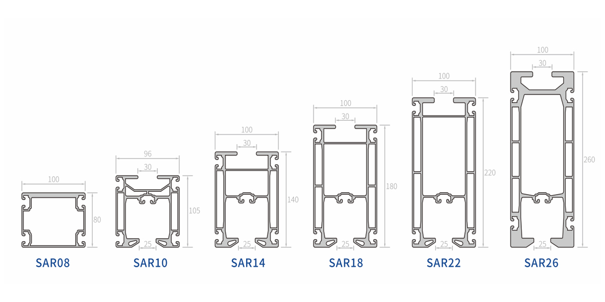 | SAR08 | Alúmanam, anodized | 4.1KG/m | 152cm^ 4/202cm^ 4 | 30cm^3/40cm^3 |